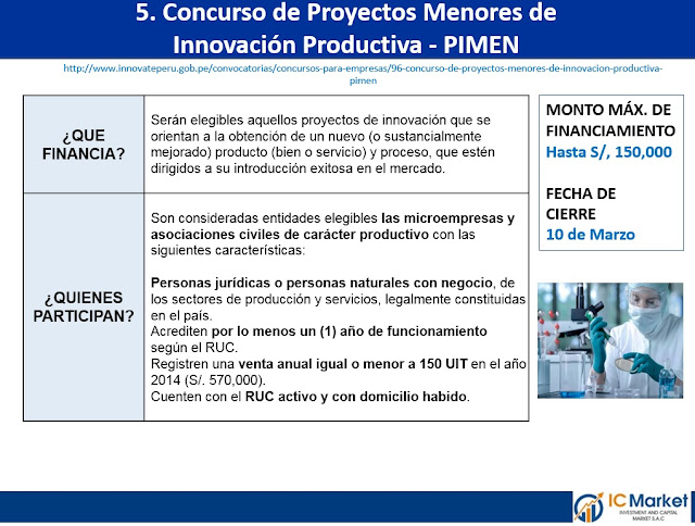 En este momento el Perú cuenta con diversas alternativas de  FINANCIAMIENTO NO REEMBOLSABLE para Proyectos (No se paga intereses ni se devuelve capital), en temas de Innovación, Productividad, Calidad, etc. que permitan mejorar su competitividad empresarial.