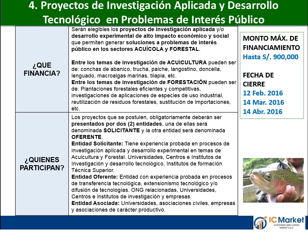 En este momento el Perú cuenta con diversas alternativas de  FINANCIAMIENTO NO REEMBOLSABLE para Proyectos (No se paga intereses ni se devuelve capital), en temas de Innovación, Productividad, Calidad, etc. que permitan mejorar su competitividad empresarial.