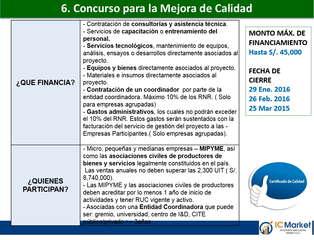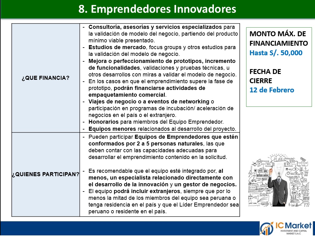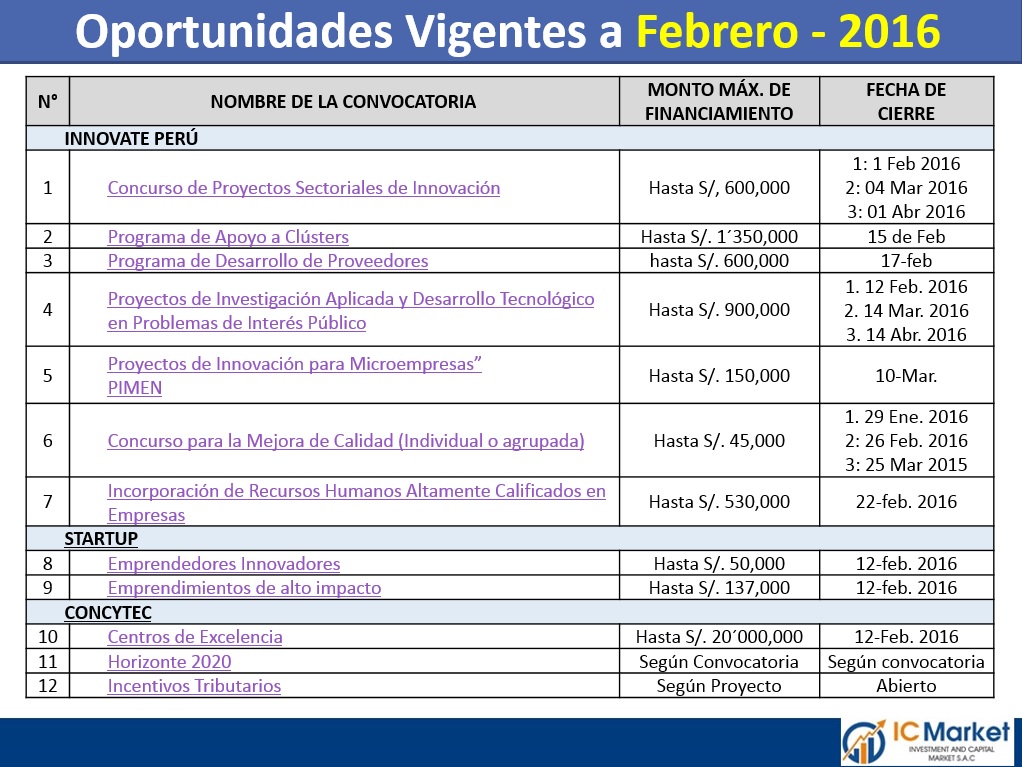 En IC MARKET. nuestro equipo profesional con amplia experiencia en estos temas ha preparado un resumen de las 12 CONVOCATORIAS VIGENTES y más relevantes para el sector productivo.